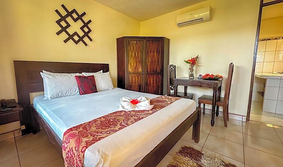 This double room has air conditioning, full bed, sofa, cable TV and a full bathroom. A refrigerator and coffeemaker are included. Guests can enjoy swimming pool views.